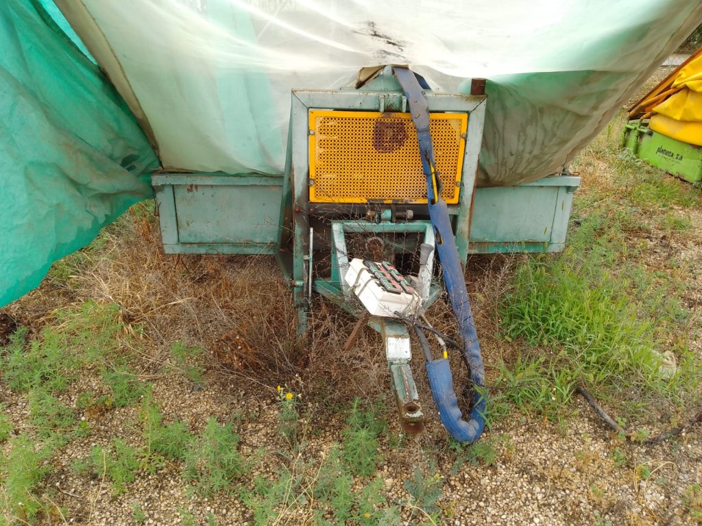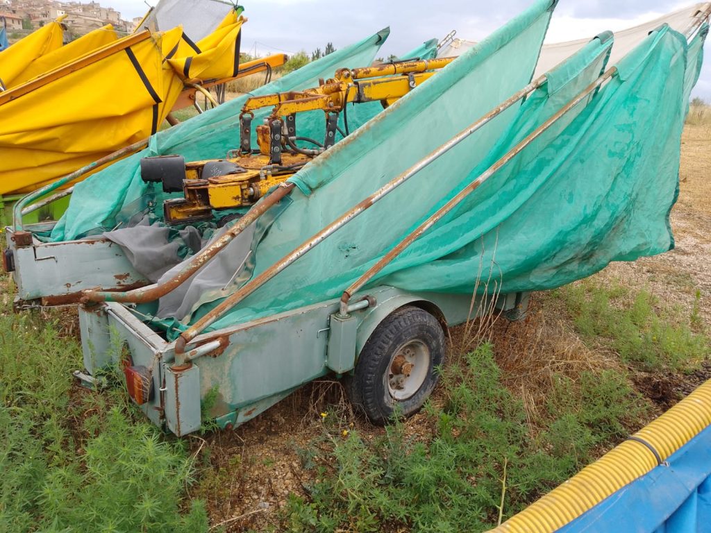 Recolector de almendras, aceitunas y frutos secos trasero equipado con sistema de vibración tipo remolque.